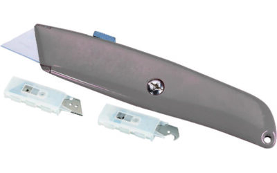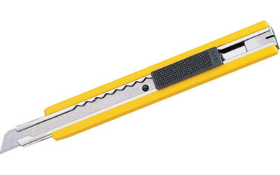 Corps en plastique jaune sur armure inox, curseur à cliquet de sûreté, porte lame plat allongé...