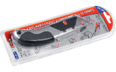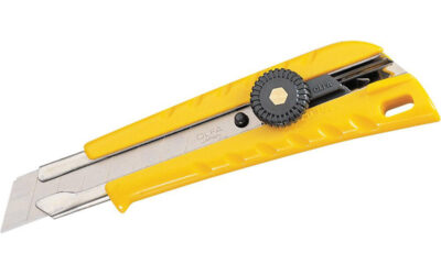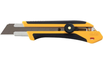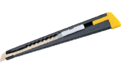 Modèle noir en métal, tête jaune, curseur à cliquet. Livré sur carte libre-service Olfa.