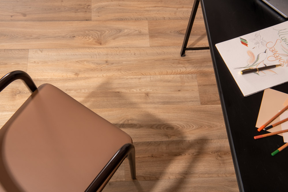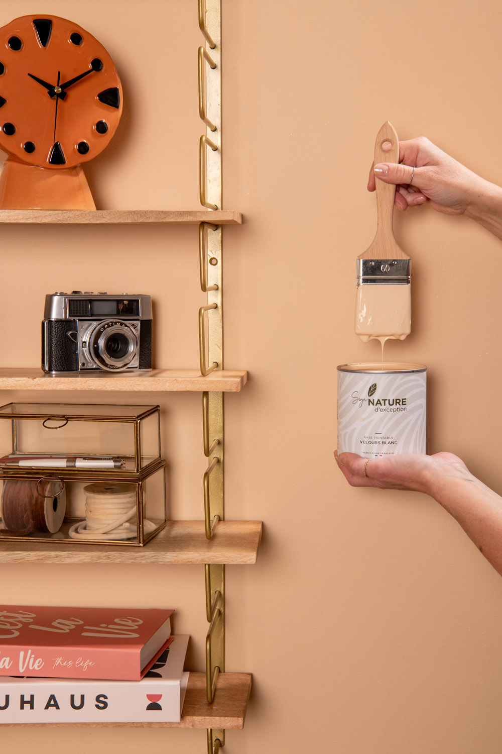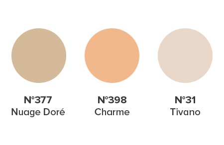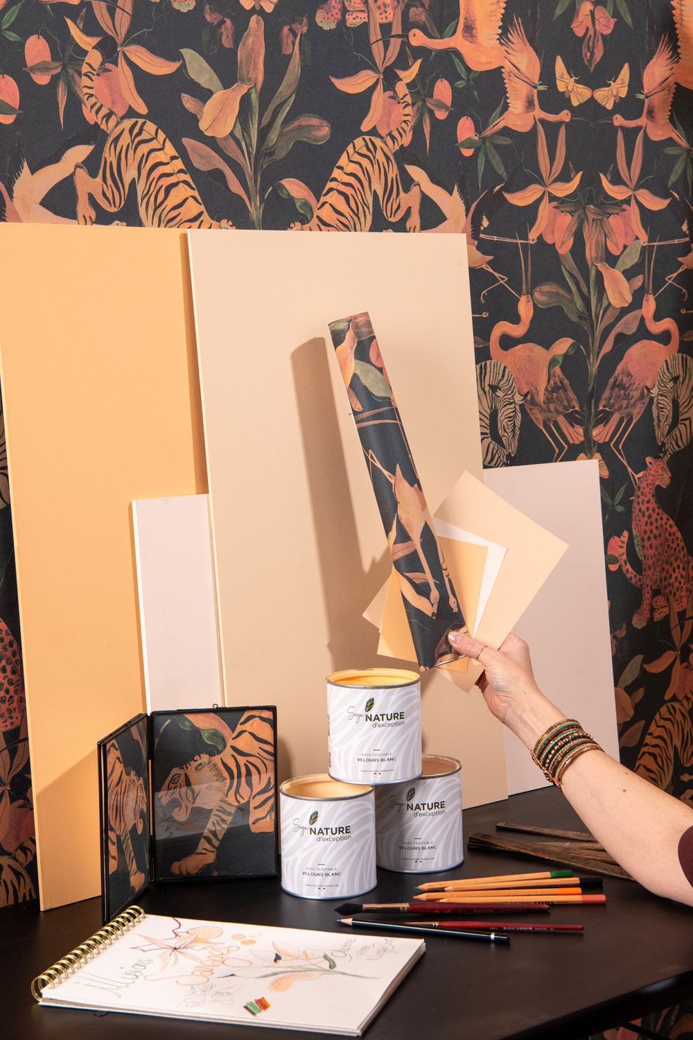 La couleur « Nuage Dorée », issue de la gamme Sign’NATURE, capte la lumière avec délicatesse. Ni trop vive ni trop pâle, elle réchauffe l’espace avec subtilité. Associée aux teintes boisées du sol et aux nuances profondes du papier peint, elle équilibre la puissance visuelle des motifs. Une palette ensoleillée, inspirée de la terre et du sable chaud.