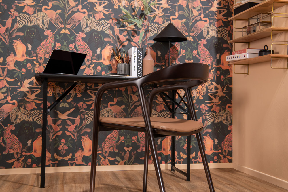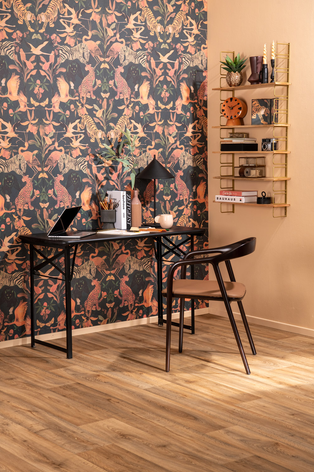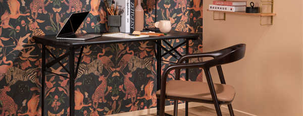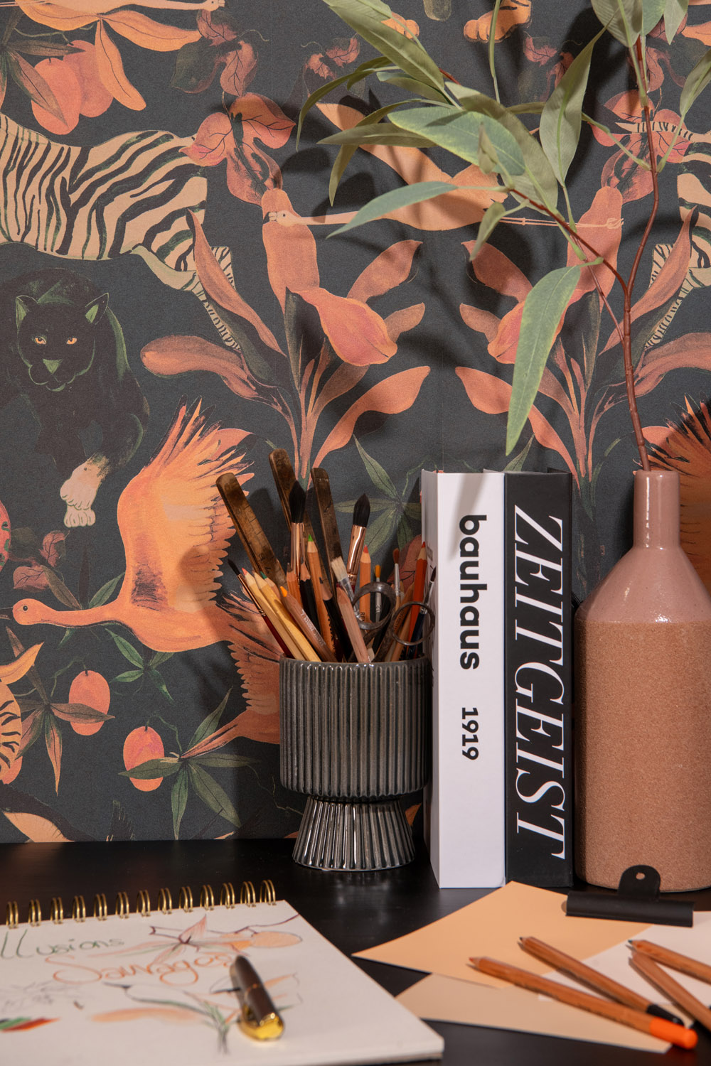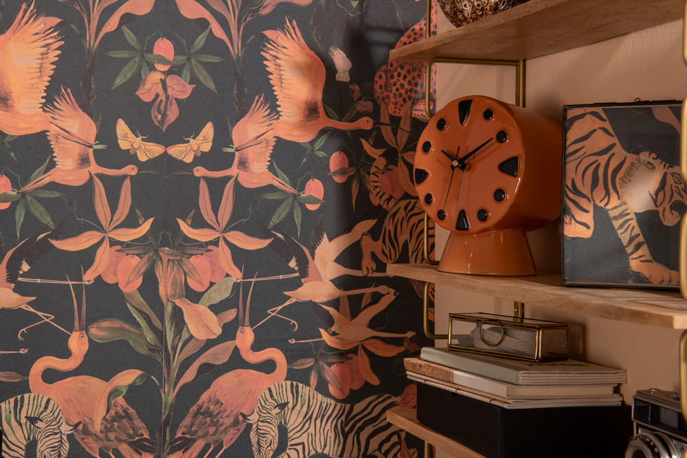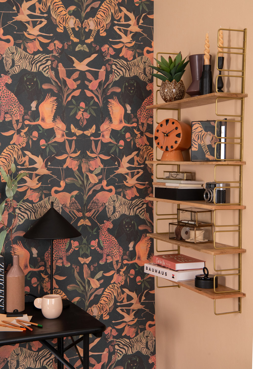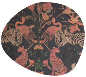 Panthères, zèbres, flamants et léopards composent un ballet visuel hypnotique. Le motif « Illusions Sauvages » est un hommage à la faune stylisée, dans une composition symétrique qui rappelle les paravents japonais ou les tapisseries d’antan. Poétique et puissant, il transforme le mur en un univers narratif, à la frontière entre conte exotique et art décoratif.