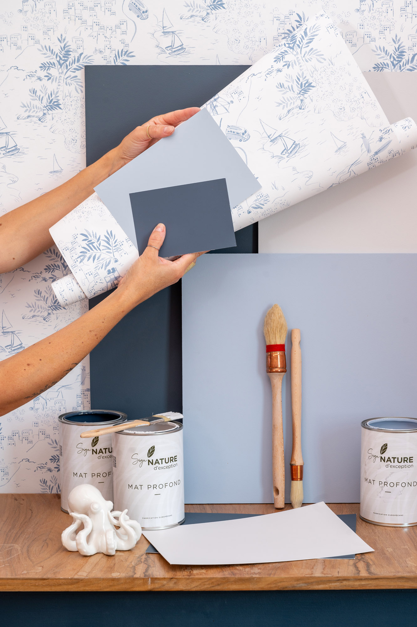 Palette de bord de mer modernisée : un bleu gris ultra tendance : Kara n°136, un incontournable gris souris : Auro n°14 et un bleu profond minéral pour rehausser l’harmonie : Calcite n°91