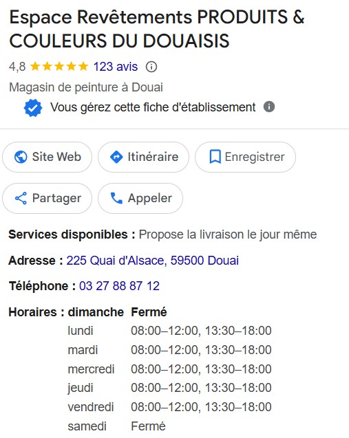 Je recommande vivement Espace Revêtements – Produits & Couleurs du Douaisis ! Laetitia et son équipe ont été extrêmement accueillants, professionnels et de bons conseils. Leur large choix de peintures (avec teinte personnalisée ) m’a permis de trouver exactement ce dont j’avais besoin pour mes travaux. Les produits sont de très bonne qualité, le rendu est impeccable et les conseils personnalisés ont fait toute la différence. Un commerce de proximité sérieux, je reviendrai sans hésiter pour de futurs projets.