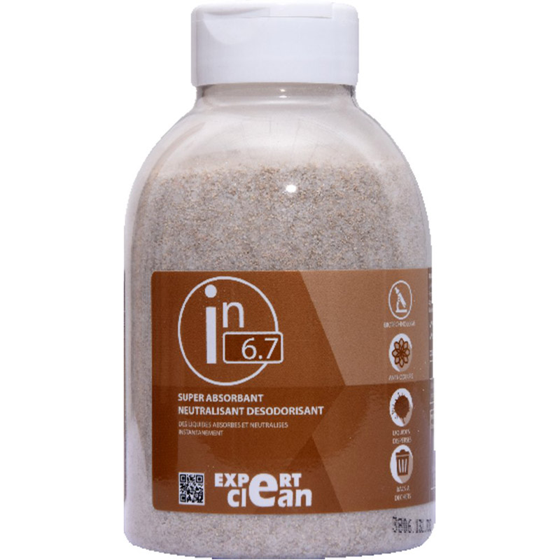 IN 6.7 absorbe efficacement les déversements de liquides de tous types, neutralise instantanément les mauvaises odeurs et diffuse un agréable parfum de propreté. IN 6.7 absorbe immédiatement tous les liquides biologies et chimiques comme l’urine, le sang, le vomi, les huiles végétales et synthétiques, les hydrocarbures, les solvants Très efficace, il absorbe jusqu’à 90 fois son volume.