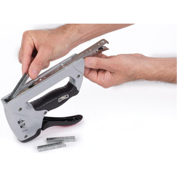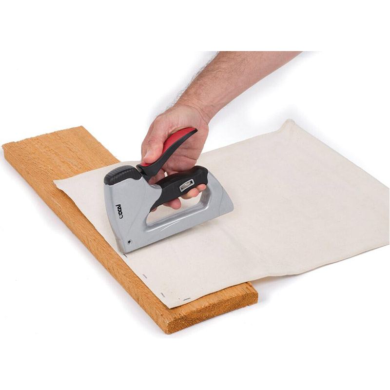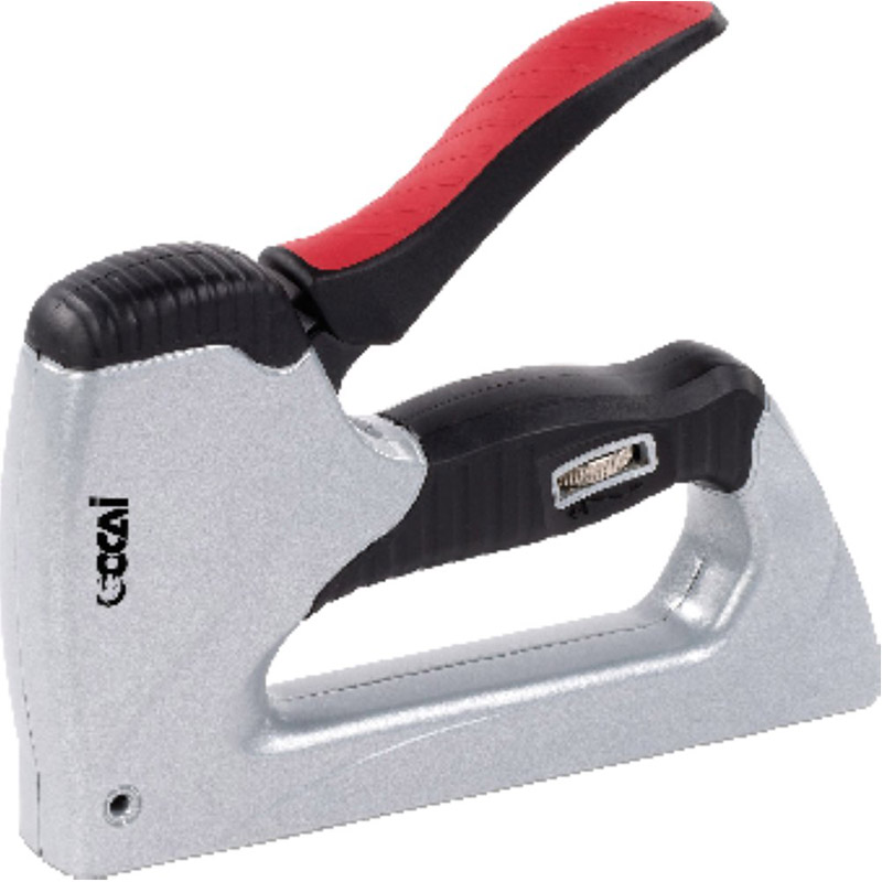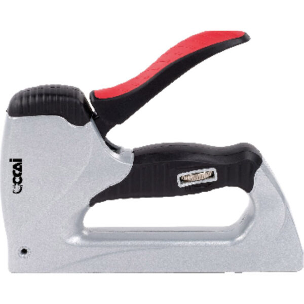 Agrafeuse et cloueuse en métal, poignée bi-matière. Chargement des agrafes par le dessous, molette de réglage de la puissance de frappe. Pour agrafes et des clous. Présentation sur carte libre service.