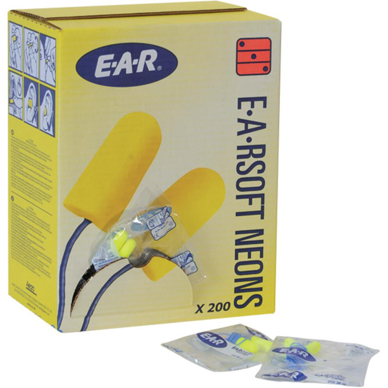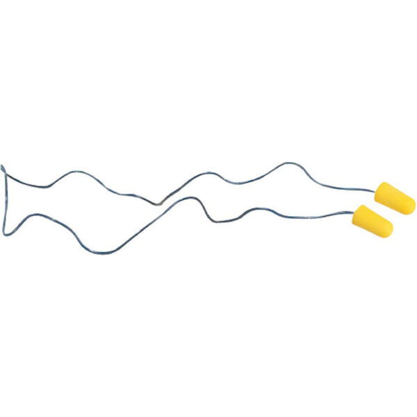 Bouchons d’oreilles en mousse de polyuréthane à expansion lente. Forme conique, avec cordes. EN 352-2. Boite de 200.