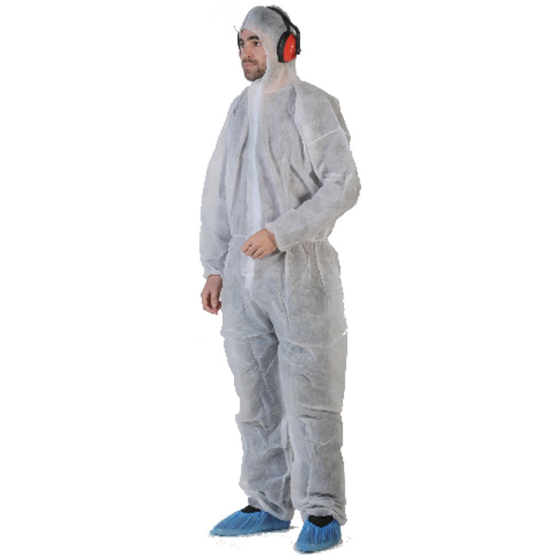 Combinaison jetable. Protection basique contre la poussière lors d’opération d’entretien et de nettoyage. Blanche en polypropylène 40 gr/m². Cagoule. Fermeture à glissière. Poignets, taille et chevilles à élastiques. Carton complet de 50 pièces.