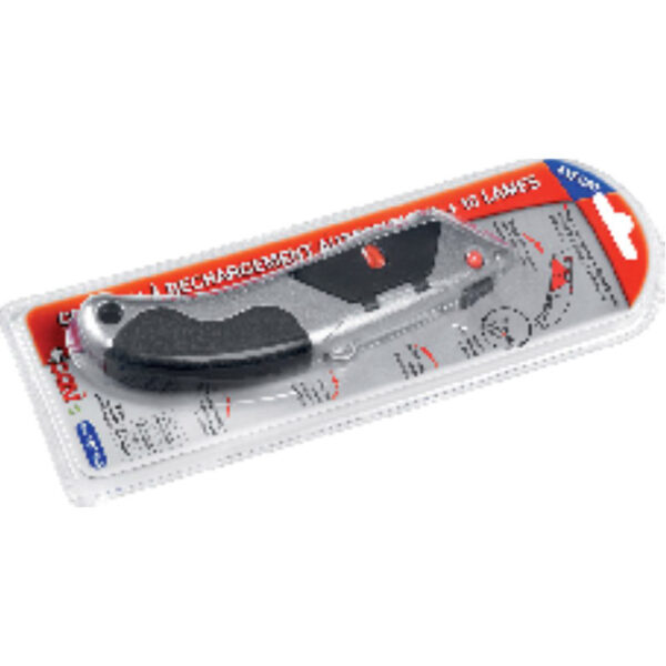 Corps métal, ergonomique et bi-matière pour une parfaite prise en main. Réservoir automatique de 10 lames : lames contenues dans un boîtier distributeur sécurisé et intégré dans le corps du couteau. Livré avec 10 lames trapèzes droites grand modèle .