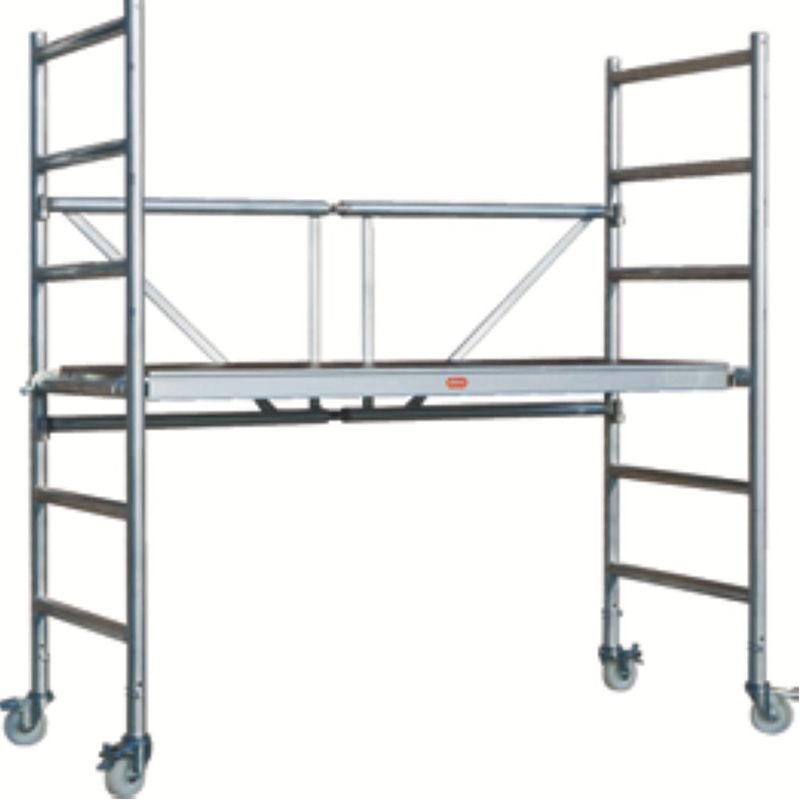 Echafaudage pliant roulant composé de 4 modules. Peut être transformé de manière rapide et aisée en un échafaudage roulant d’une hauteur de travail de 3,8 m à 7,8 m selon les modules. Le format 0,75 x 1,65 m est idéal, tant pour une utilisation intérieure qu’extérieure. Le module A est livré avec le lot de roues (disponible séparément) composé de quatre roues à double frein (100 mm) pour une sécurité optimale. Les cadres sont équipés d’échelons avec profil antidérapant, pour gravir l’échafaudage en toute sécurité. Grâce à la conception unique, les stabilisateurs triangulaires ainsi que les plinthes sont faciles et rapides à poser. Convient pour l’utilisateur profesionnel. Léger, compact et robuste. Facile à monter et transporter grâce à sa base pliante.