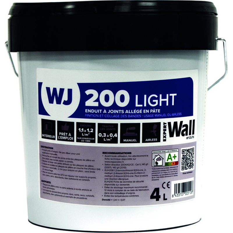 Enduit allégé en pâte. Finition et collage des bandes à joint. Application manuelle ou airless. Reboucher et remplir les joints entre les plaques de plâtre en intercalant une bande papier ou armée. Réparer et lisser des petits défauts sur les plaques de plâtre. Enduire en totalité les plaques de plâtre en couche fine (Finition Q4). Application manuelle ou airless. Epaisseur maximale : 2mm pour enduire en plein, sans limite en rebouchage. Consommation : 1.1 à 1.2 L/m² pour 1 mm d’épaisseur..