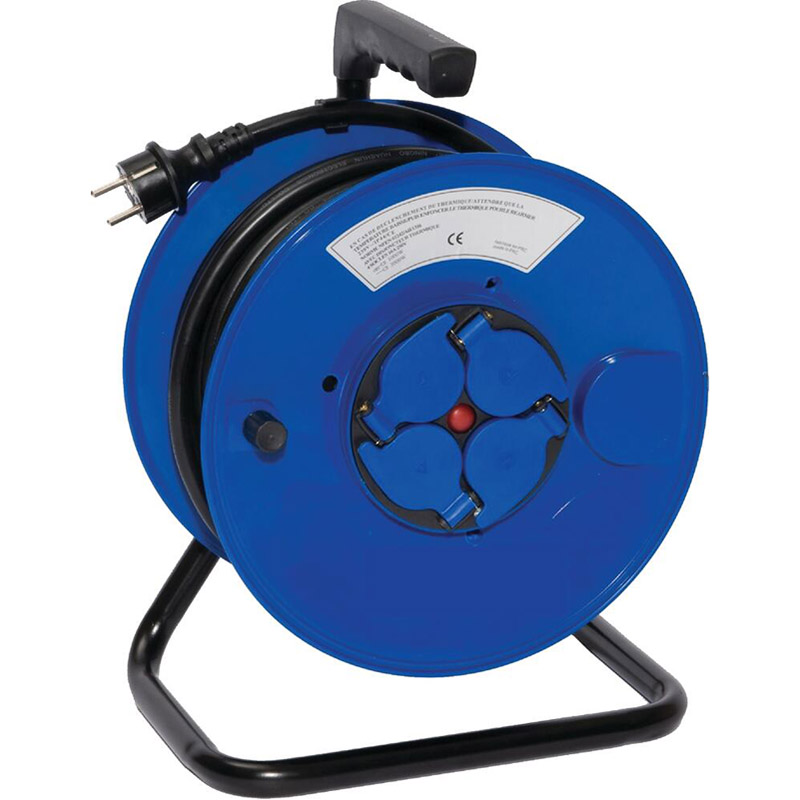 Enrouleur électrique 4 prises. 40 m de câble HO7RNF 3G1,5. 4 socles. Disjoncteur thermique. Courant alternatif 250 V. Puissance 1100W – 3200 W. IP 44.