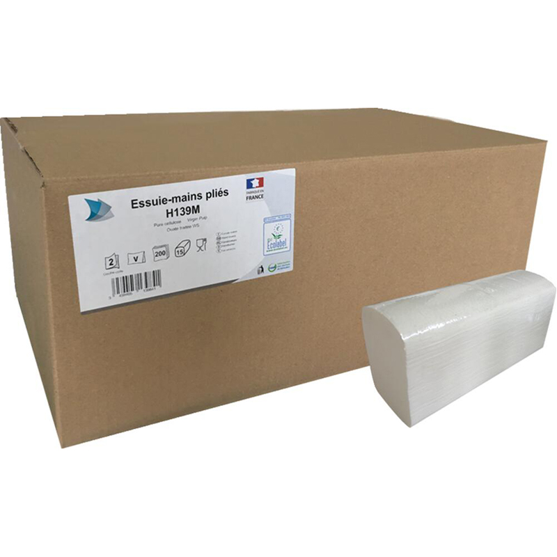 Essuie mains plié en V. Pure ouate de cellulose. 2 plis – 2 X 17 gr/m². Gaufré. Formats 21x21cm. 200 formats/paquet.