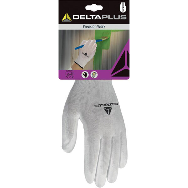 100% polyester. Enduction polyuréthane sur paume et bout des doigts. Jauge 13. Normes : EN420:2003+A1:2009 5 + EN388:2016 3-1-2-1-X.