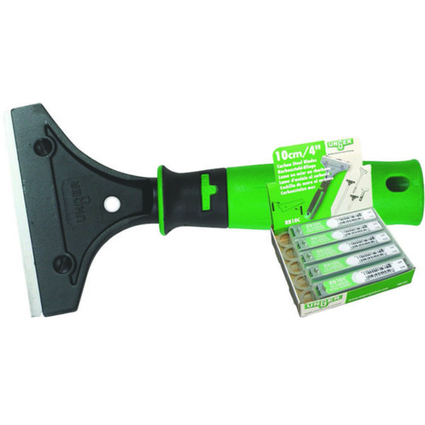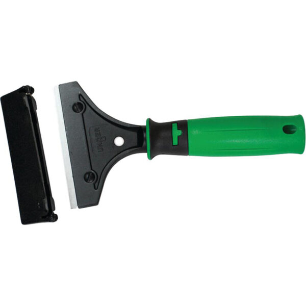 Grattoir de surface ergonomique. Poignée en deux parties en plastique agréable. Tête métallique inclinée. Lame avec un côté coupant et un non-coupant. Livré sans lame.
