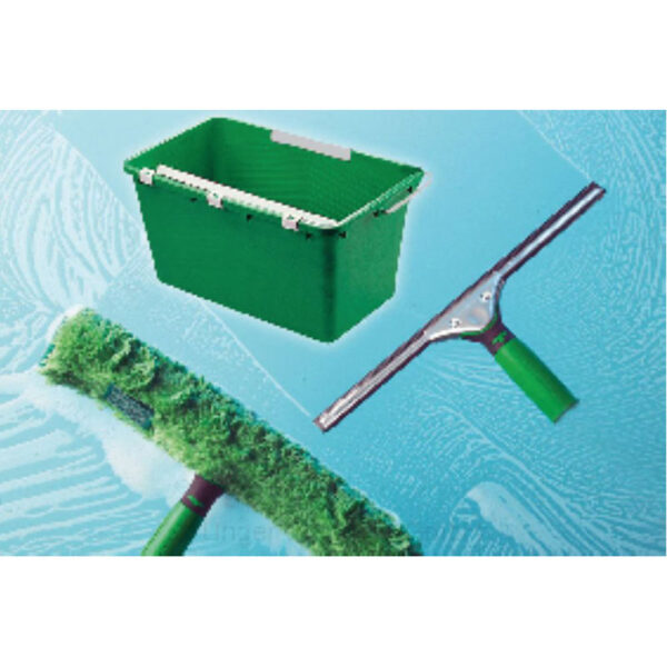 Kit de démarrage pratique. Raclette ErgoTec 35 cm. Support mouilleur ErgoTec 35 cm. Mouilleur MicroStrip 35 cm. Seau de 18 l.