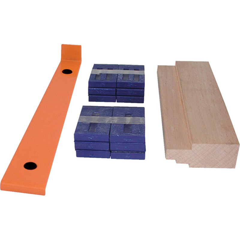 Kit de pose parquet. Comprend 50 cales PVC + 1 pied de serrage métal + 1 cale de frappe PVC rainurée.