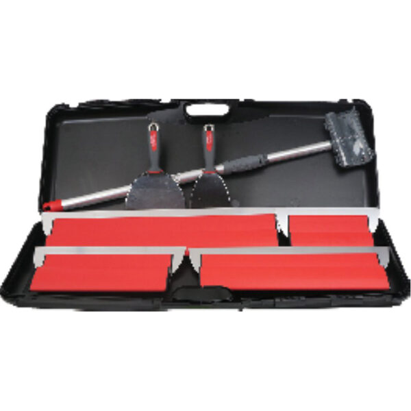 Valise spéciale pour plaquiste. Lames Parfait Liss 25, 35, 45 et 60 cm. Couteaux plaquiste : inox choc 10 et 15 cm (embout vissage). Perche ParfaitLiss’ : 2 x 0,50 m. Plus de confort, plus de productivité.