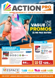 ACTIONPRO OFFRES VALABLES DU 1er JUIN AU 31 JUILLET 2025 ON N’EST JAMAIS MIEUX CONSEILLÉ QUE PAR UN SPÉCIALISTE www.espacerevetements.com DROGUERIE PEINTURE SOL OUTILLAGE MUR 84.00 HT le fût € SATURATEUR BOIS ENVIRONNEMENT - 5L ®Chantier réussi et terminé en 1 demi-journée. ®Application en 2 couches frais sur frais. ®Séchage rapide. ®Anti-glissant - NF EN 13036-4. ®Entretien facile sans ponçage. ®Rénovation locale possible. ®Rendement : 10 à 15 m²/l . ADHÉRENCE PARFAITE Imprégnation et protection des terrasses bois, caillebotis, planchers extérieurs et boiseries verticales. EAU NUANCIER BOIS (À NE PAS RATER) UNE VAGUE DE PROMOS TOUS BOIS EXOSILANE - 15L ®Aspect mat minéral. ®Grande résistance à l’encrassement. ®Formule renforcée contre le développement des micro-organismes. ®Rendement : 6 à 9 m²/l/couche . FORTE MICROPOROSITÉ Peinture mate minérale microporeuse à base de copolymères acryliques additivées siloxane en phase aqueuse. FÛTS ACHETÉS 2 OFFERT 1 + 125.81 HT le fût €