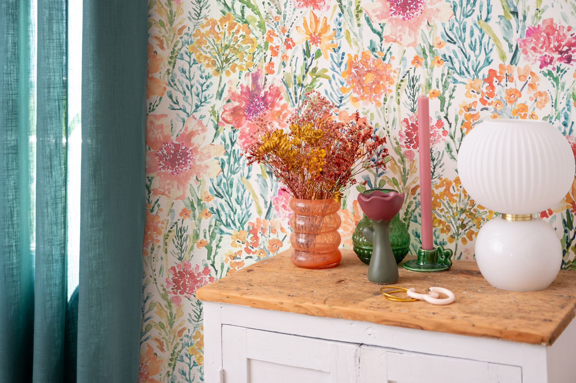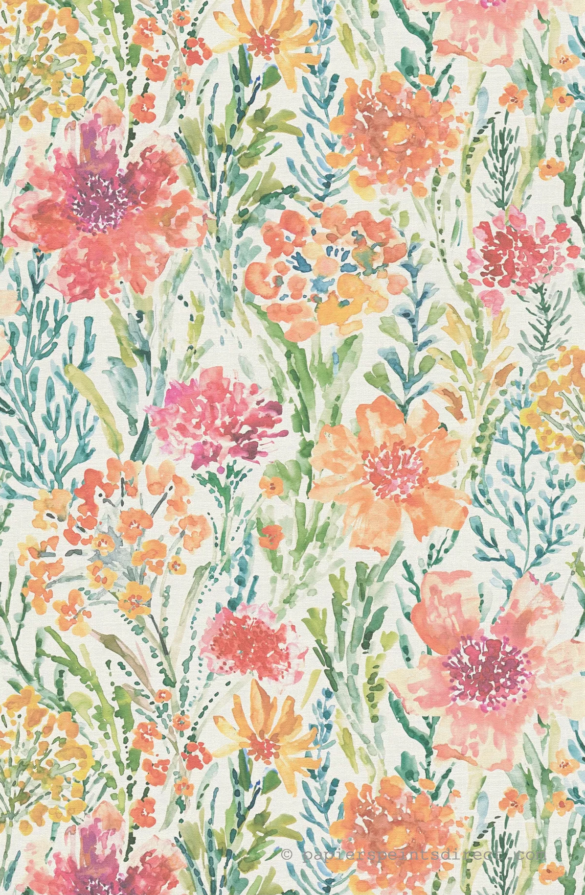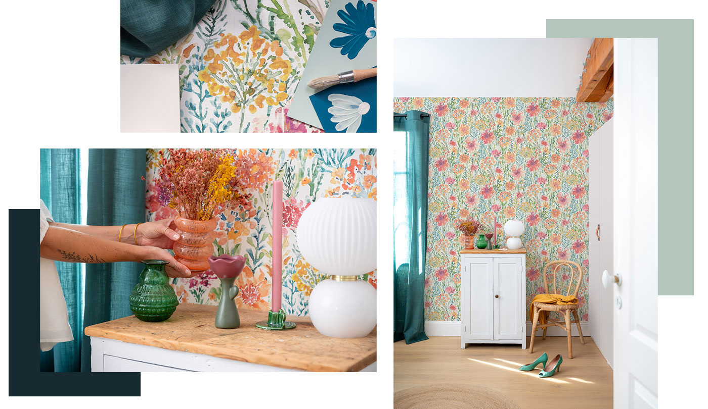 Le papier peint Simone propose ici une interprétation du motif floral façon aquarelle. On est clairement dans un tableau où les touches de peinture forment un tout pour nous plonger dans un printemps qui dure toute l’année.