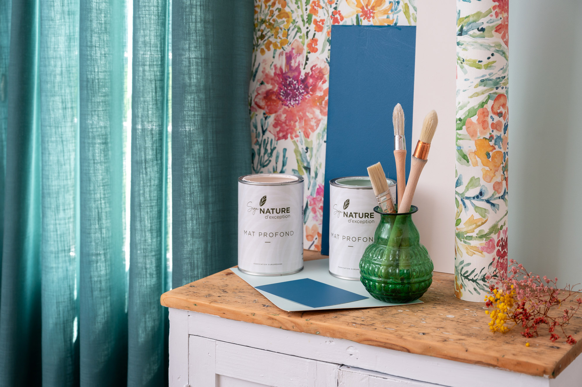 Ici, les couleurs se complètent dans un mélange de délicatesse et de présence. Accalmie n°386 (vert amande) et Caresse n°379 (incontournable beige) habillent l’espace avec légèreté tandis que Koro n°152, ce bleu profond, vient s’imposer pour donner du caractère à votre pièce.